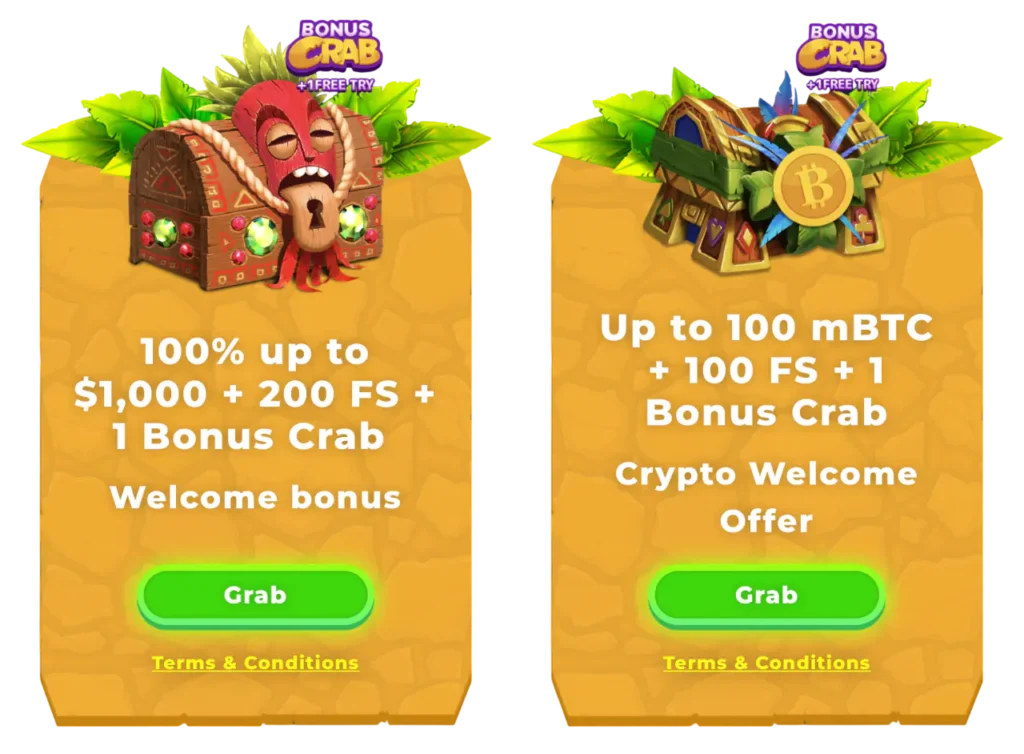 | Crypto Welcome Bonus | Up to 100mBTC + 100 FS + 1 Bonus Crab | 1mBTC | 35/40x | 0.25mBTC | 10 Days |